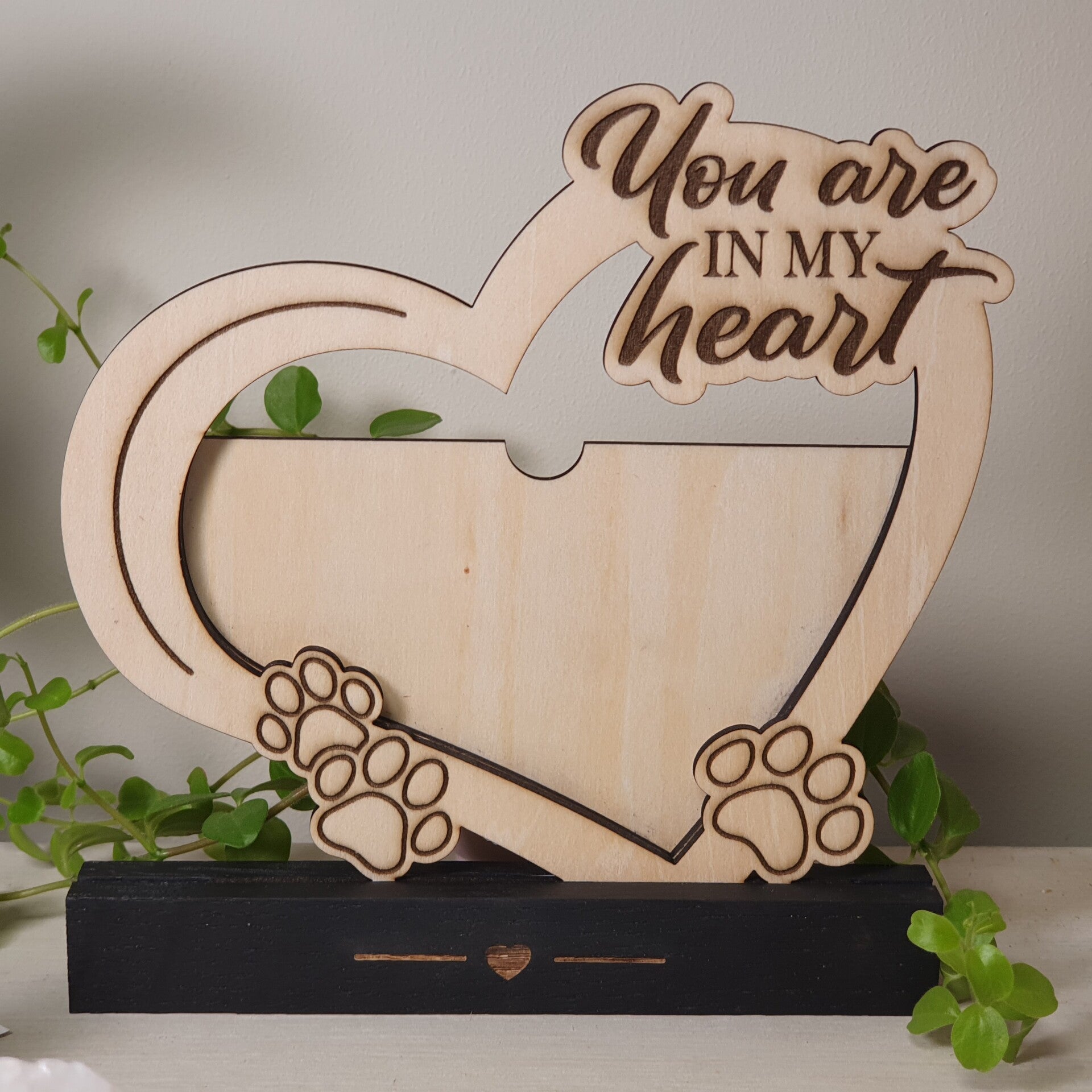 De lijst is zorgvuldig afgewerkt met gegraveerde tekst ("Forever in my heart" of "You are in my heart"), twee schattige pootjes en een elegante strik. De standaardafmeting is 17x16 cm, maar maatwerk is mogelijk op aanvraag.